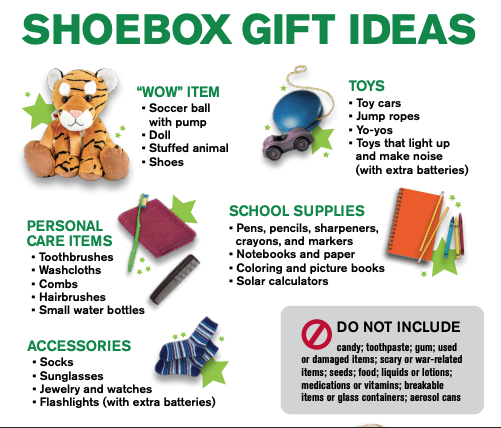 Fill a shoebox with the suggested items on the picture and return your box on Sunday November 3rd.
